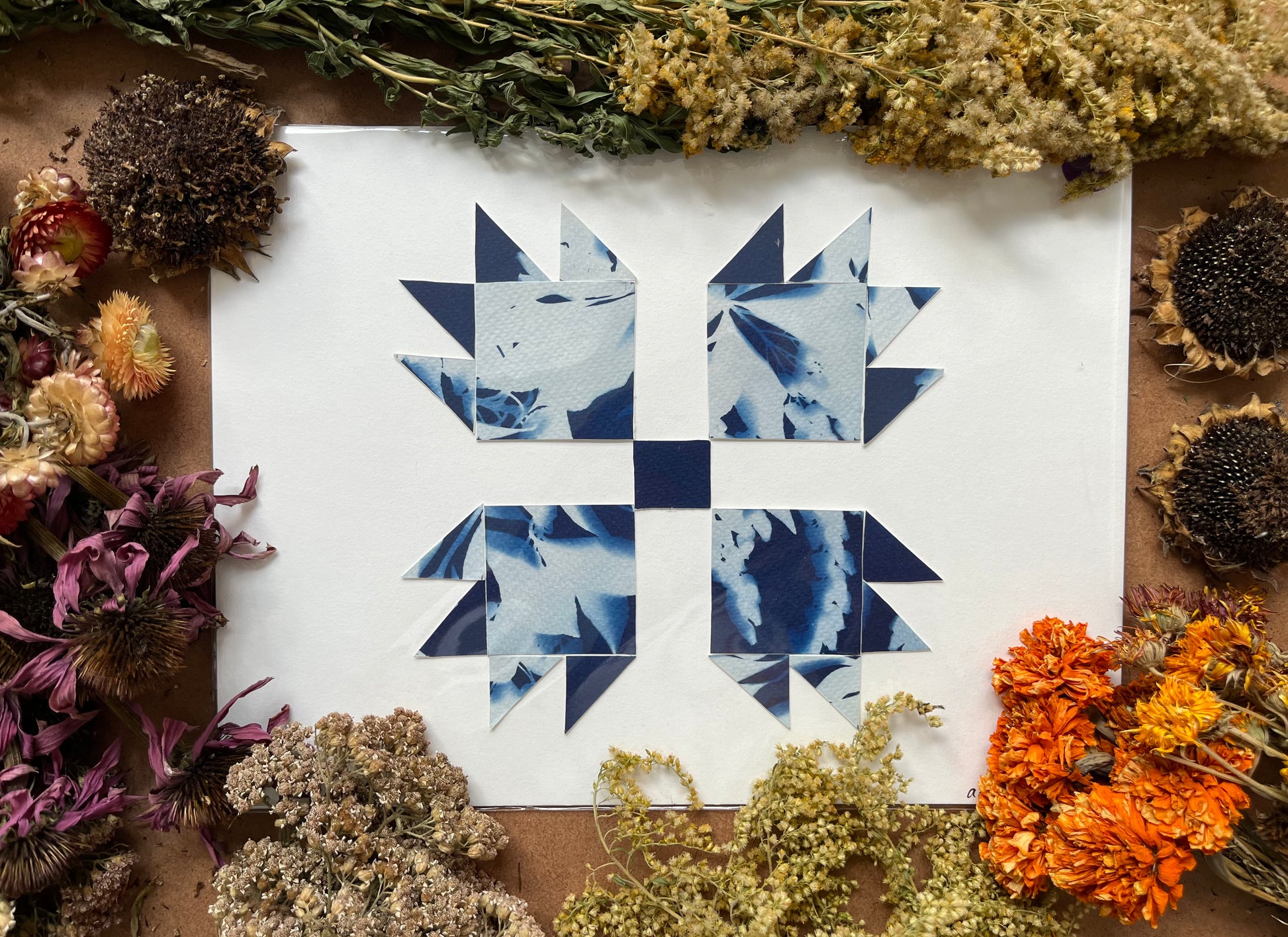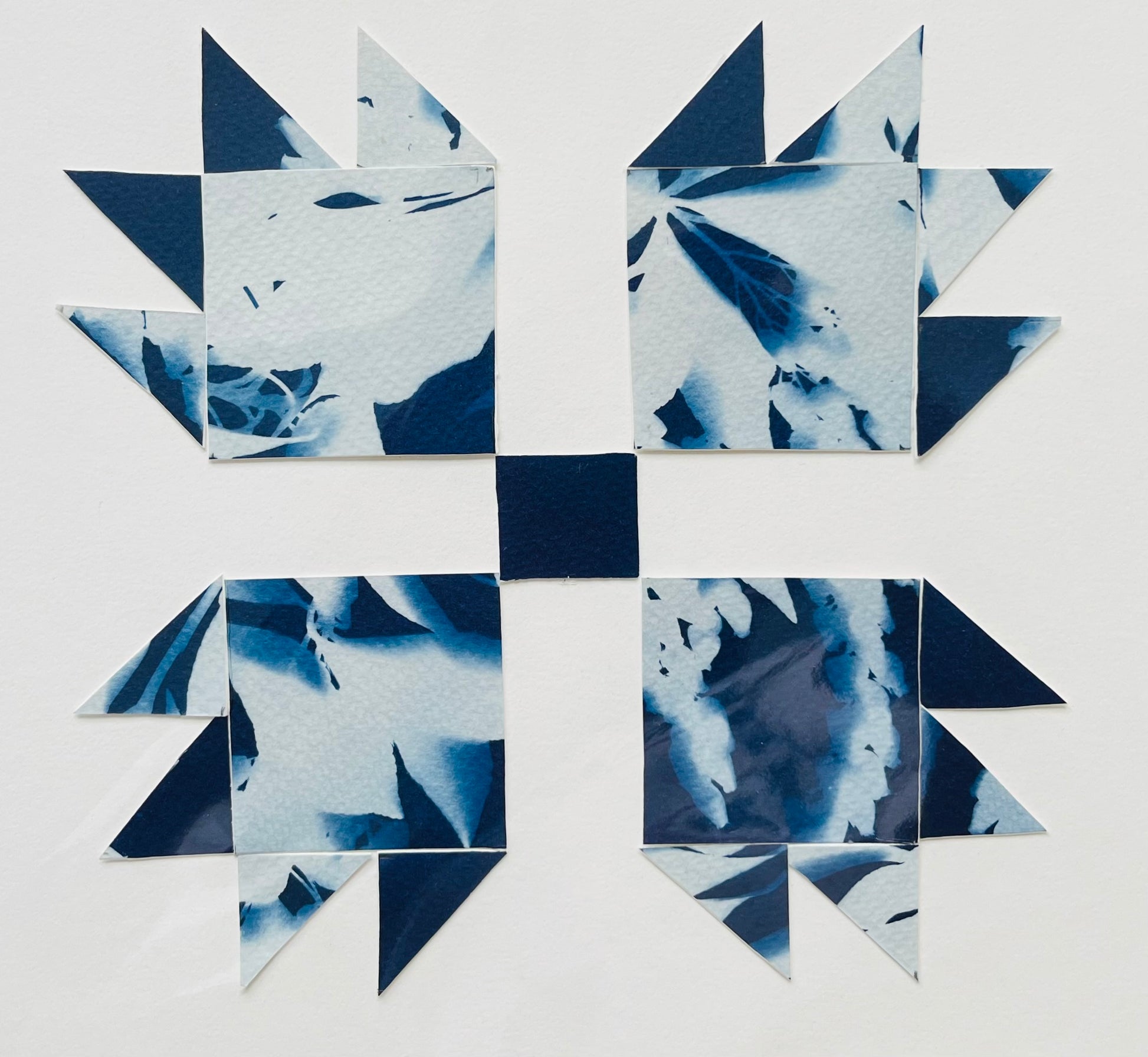 Original papercraft quilt blocks, collaged onto card stock. 9 x 12 in. Packaged in cellophane.