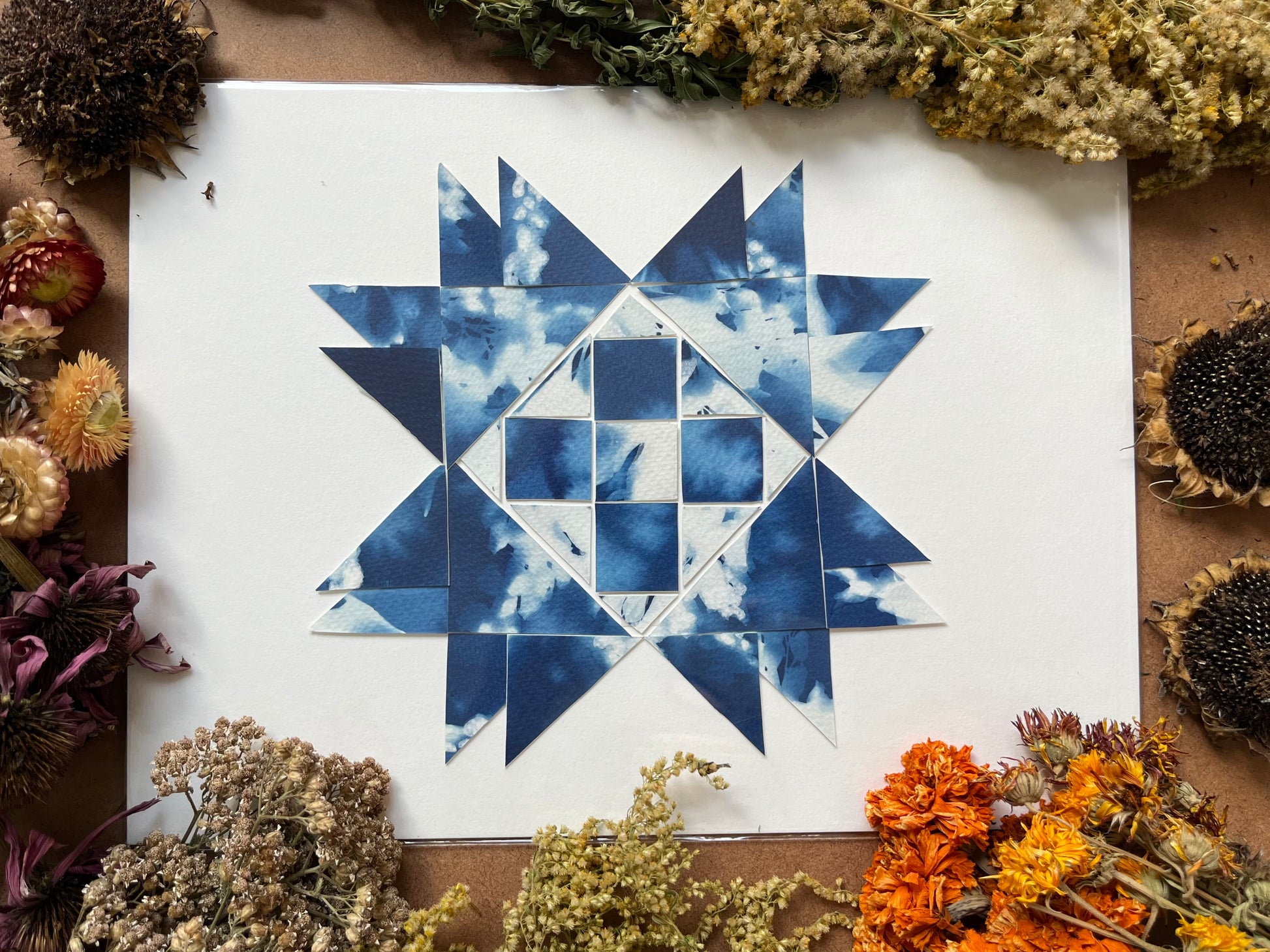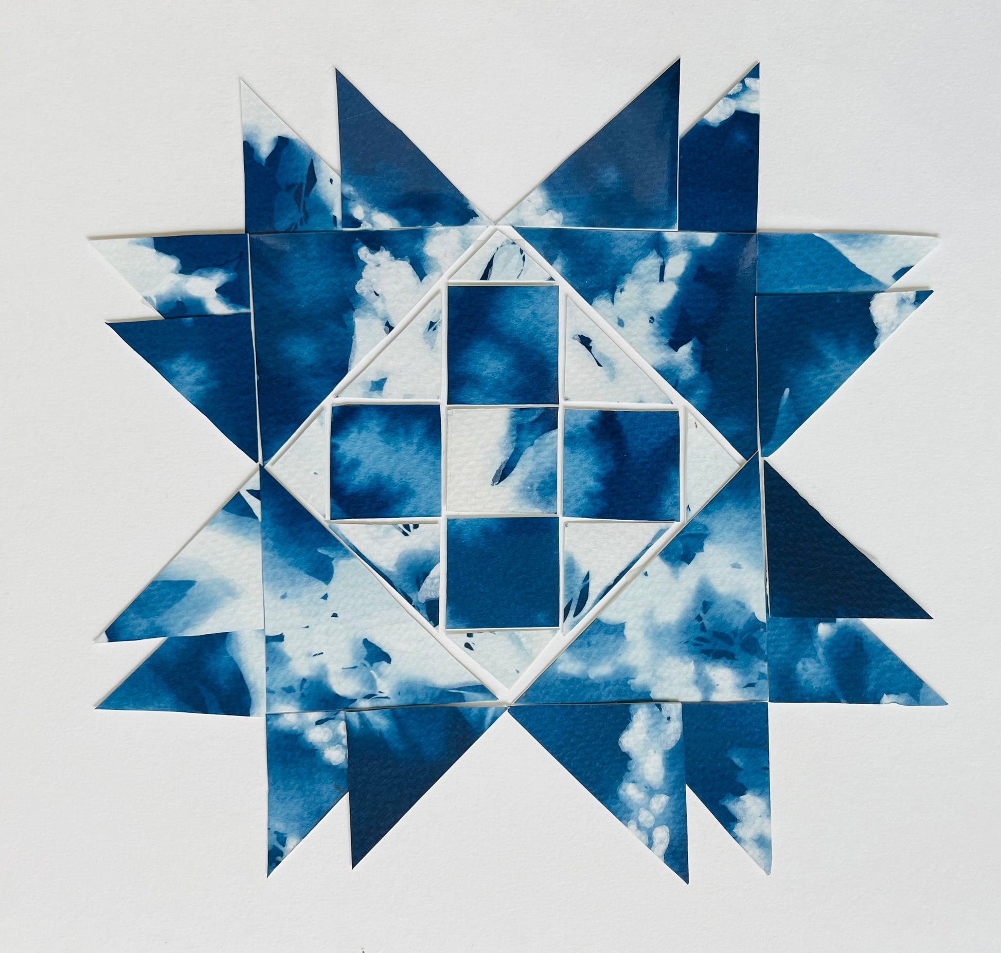 Original papercraft quilt blocks, collaged onto card stock. 9 x 12 in. Packaged in cellophane.