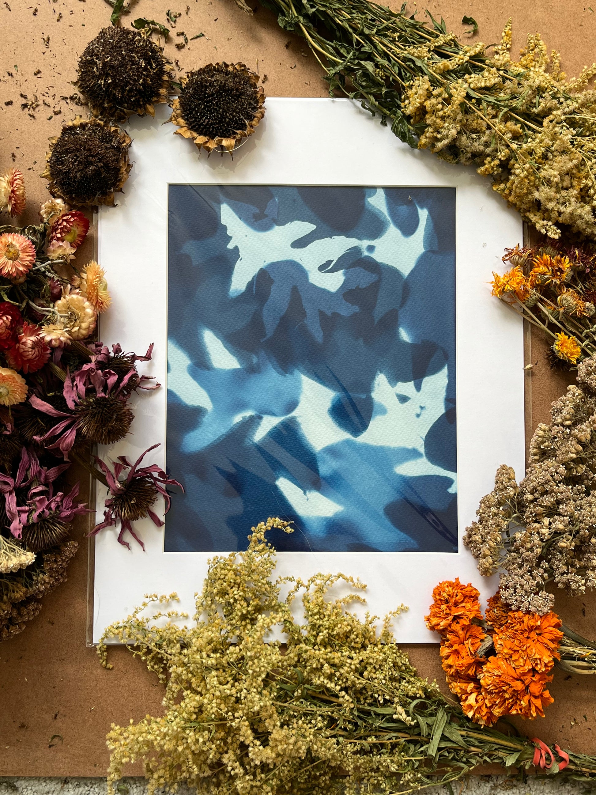 Original prints made using the Victorian cyanotype technique. Packaged in cellophane.