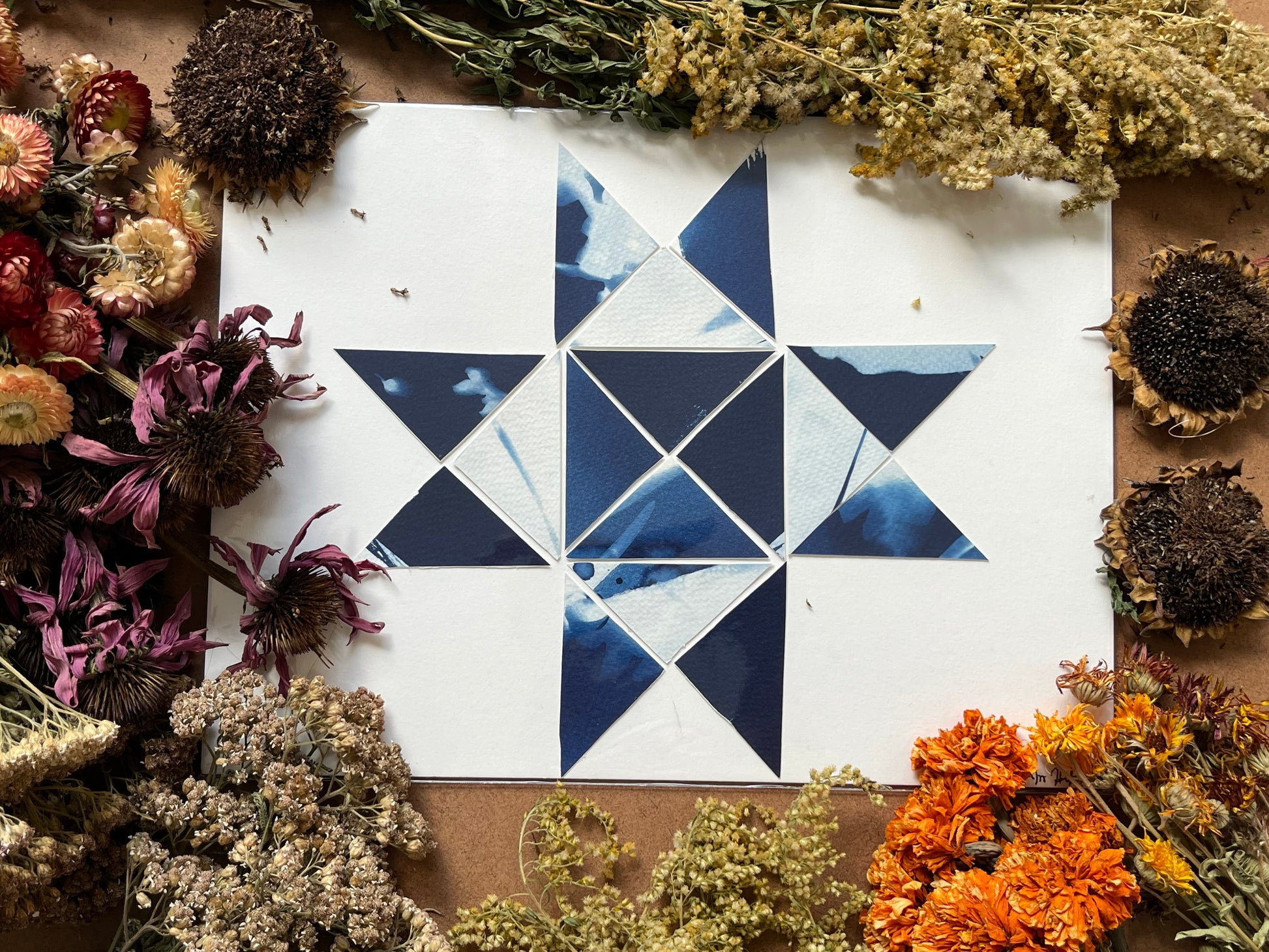 Original papercraft quilt blocks, collaged onto card stock. 9 x 12 in. Packaged in cellophane.