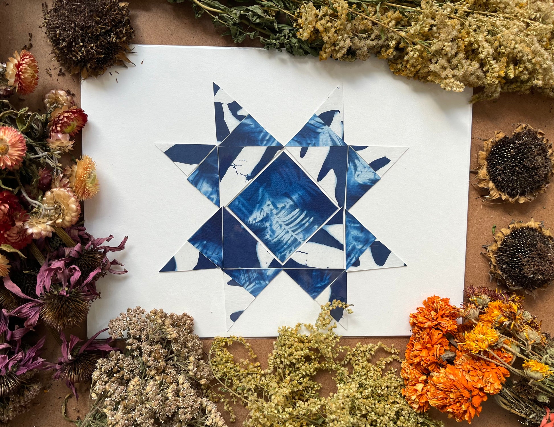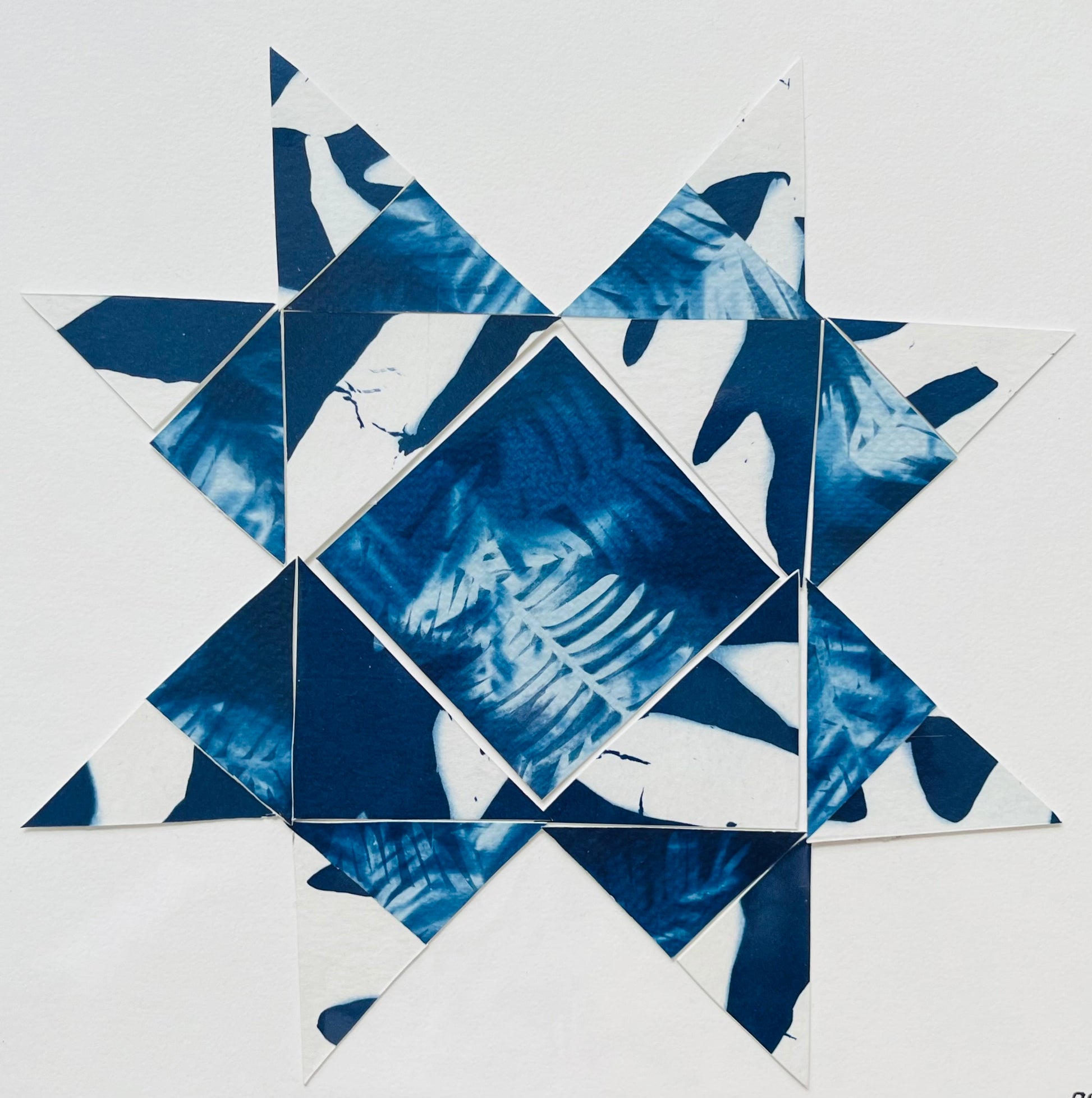 Original papercraft quilt blocks, collaged onto card stock. 9 x 12 in. Packaged in cellophane.