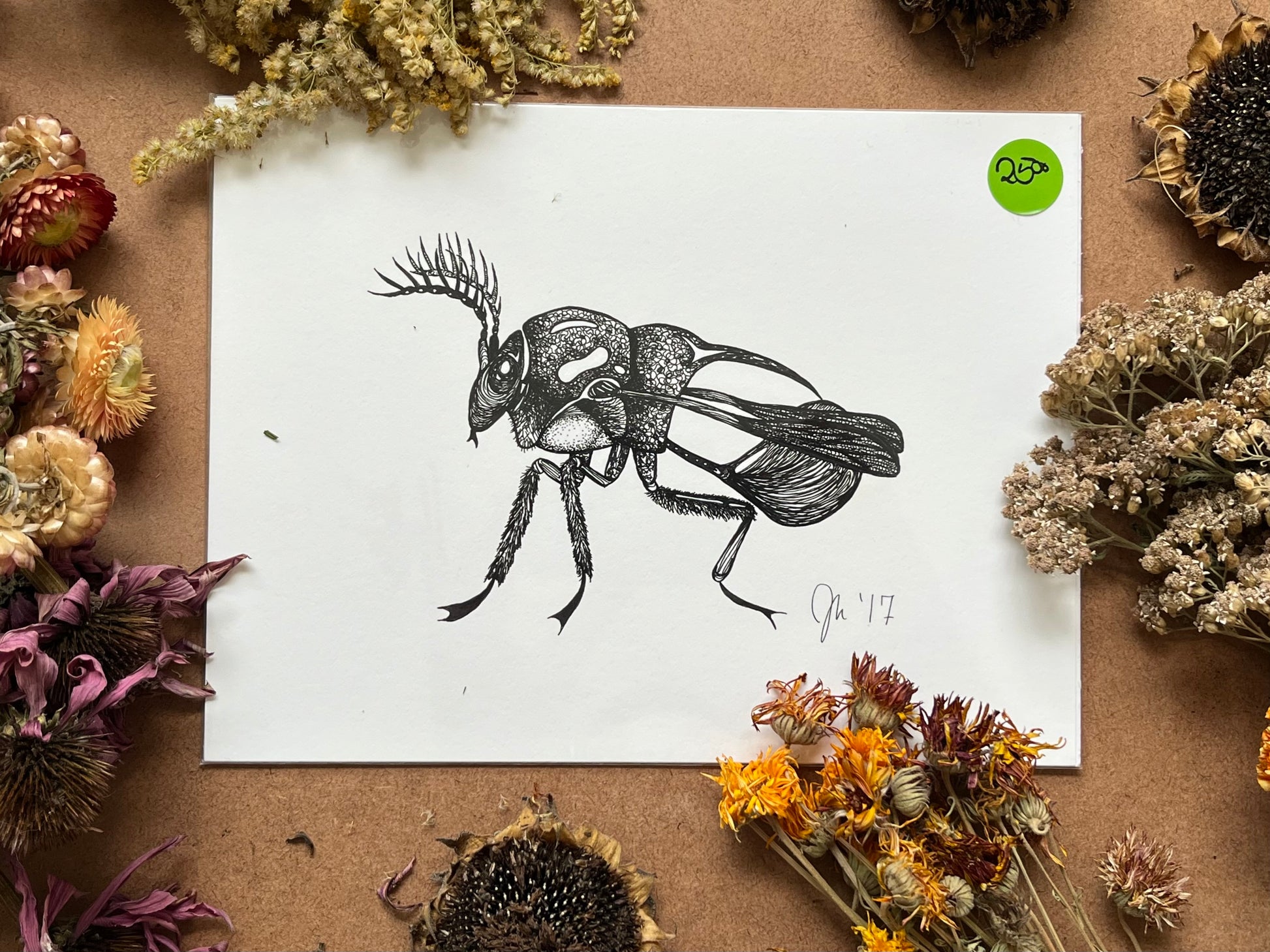 Original line art printed onto archival quality, 100% acid-free cotton rag paper. 5 x 7 in. Packaged in cellophane.